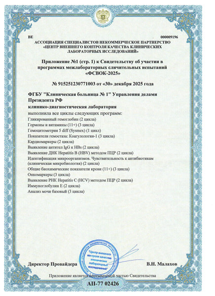 В 2025 году клинико-диагностическая лаборатория прошла верификацию в рамках национальной программы внешней оценки качества «ФСВОК-2025» (организатор – «Центр внешнего контроля качества клинических лабораторных исследований»).